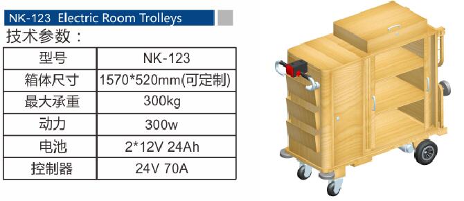 电动客房服务车 广泛应用于酒店及宾馆,服务车箱体外观形状及规格大小可依要求订制,也可单独提供电动助力解决方案: 1. 标准车型包括箱体、动力底盘、杂物袋、仿撞轮等; 2. 容量超大的柜子提供了特别宽敞储物空间; 3. 依据人体学设计的电控操作手柄、抓握舒适、操作灵活便捷